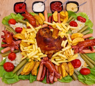 ziemniaki smażone, kiełbasa pieczona, parówki, ogórek kiszony, kapusta kiszona, pomidorki, sos do wyboru